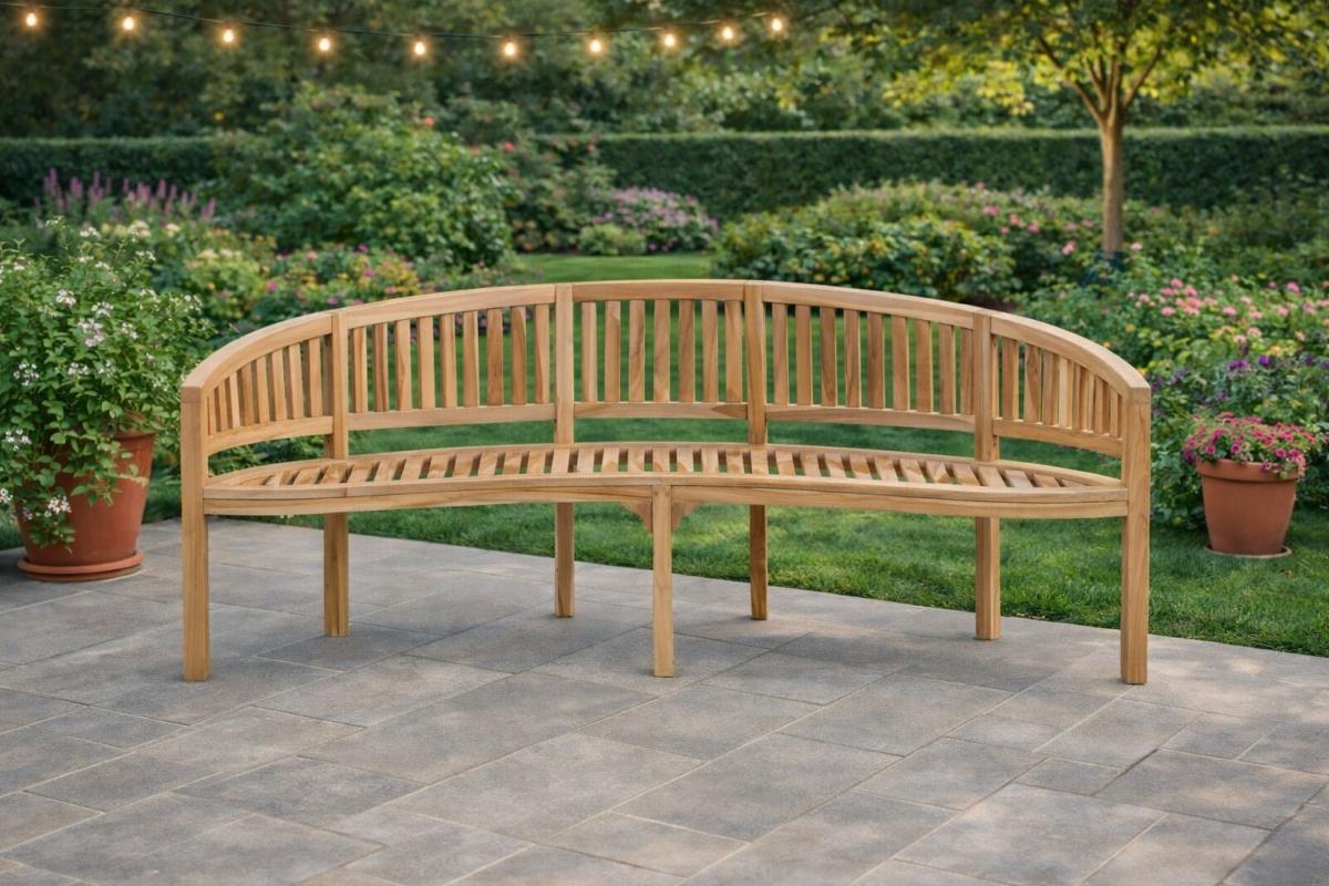 Banc en teck massif de 200 cm, au design banane élégant, robuste et durable. Résistant aux intempéries, idéal pour jardin, terrasse ou intérieur. Livraison gratuite.