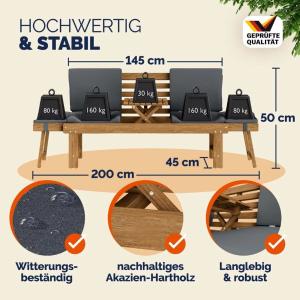 Ce banc robuste fabriqué en acacia massif, 4 en 1 de 200 cm de longueur avec coussins, multifonctionnel est adapté pour 2 ou 3 personnes.