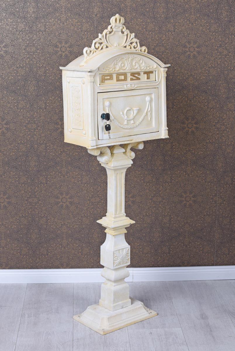 Cette boîte aux lettres sur pieds est fabriqué fonte, revêtu d'une peinture poudrée blanc antique. Une haute qualité de fabrication Allemande.