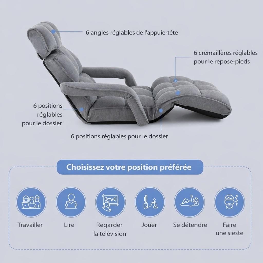 Grâce à ses multiples positions réglables, elle s’adapte à toutes vos envies : lecture, relaxation ou sieste. L’appui-tête, le dossier et la zone des hanches disposent de 6 niveaux de réglage, tandis que le repose-pieds propose 8 positions, pour un ajustement précis à votre morphologie.