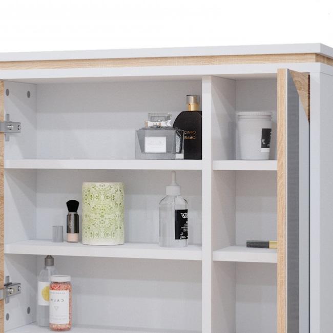 Ensemble de salle de bain complet, coloris blanc et beige composé de 4 éléments:  Armoire à glace, meuble sous lavabo, meuble haut et meuble colonne. Une grande qualité, à prix direct fabricant.