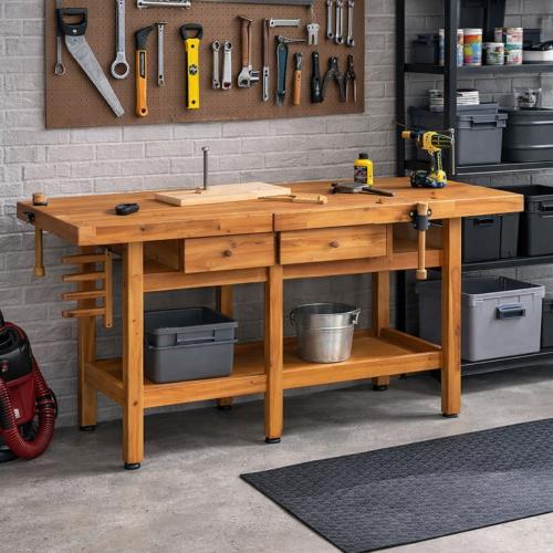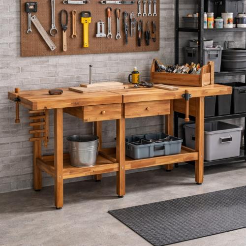 Établi en bois massif d’acacia 165 cm avec étaux et tiroirs