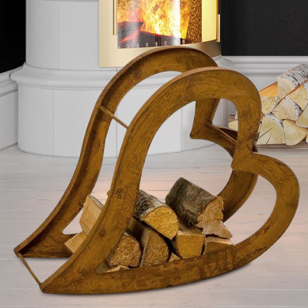 Étagère à bûches décorative en métal en forme de cœur couché, finition rouille. Idéale pour le rangement du bois de chauffage en intérieur ou extérieur. Pratique, design et robuste. Livraison gratuite.