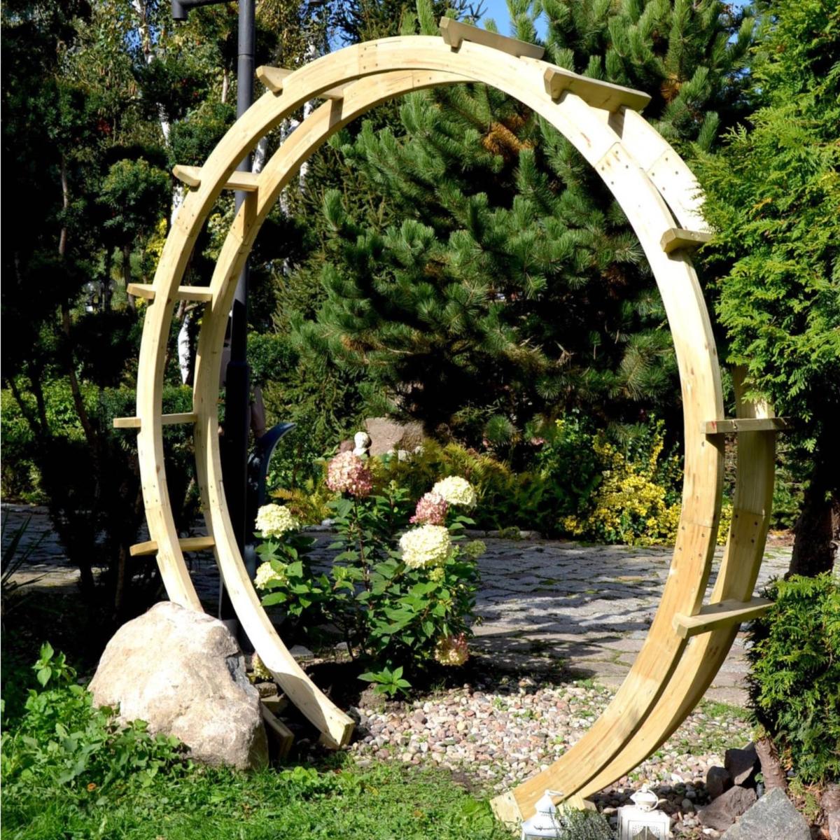 La pergola circulaire en bois Moongate, d'un diamètre XXL de 250 cm est une pièce d’aménagement extérieur exceptionnelle qui transforme instantanément l’atmosphère de votre jardin. Inspirée des portails traditionnels de jardins paysagers, sa forme ronde élégante apporte harmonie et caractère à tout espace extérieur.