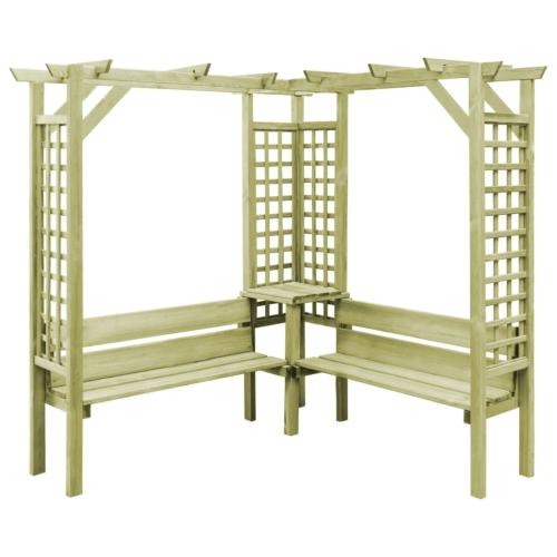 Cette grande pergola d'angle de 190 cm, avec ses 2 bancs et petite tablette, fera une magnifique décoration dans votre jardin ou votre terrasse.