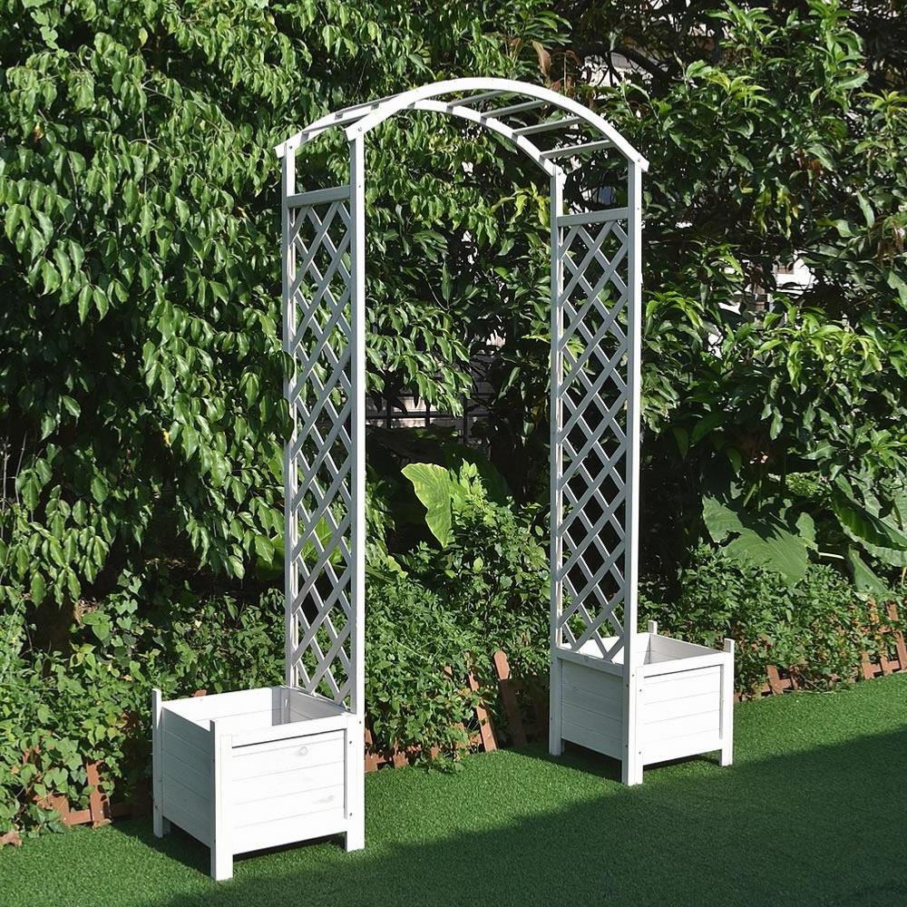 Magnifique pergola, à installer dans l'entrée de jardin ou terrasse et pouvant être décorée avec des plantes grimpantes sur le treillis, ou des fleurs dans les 2 bacs.