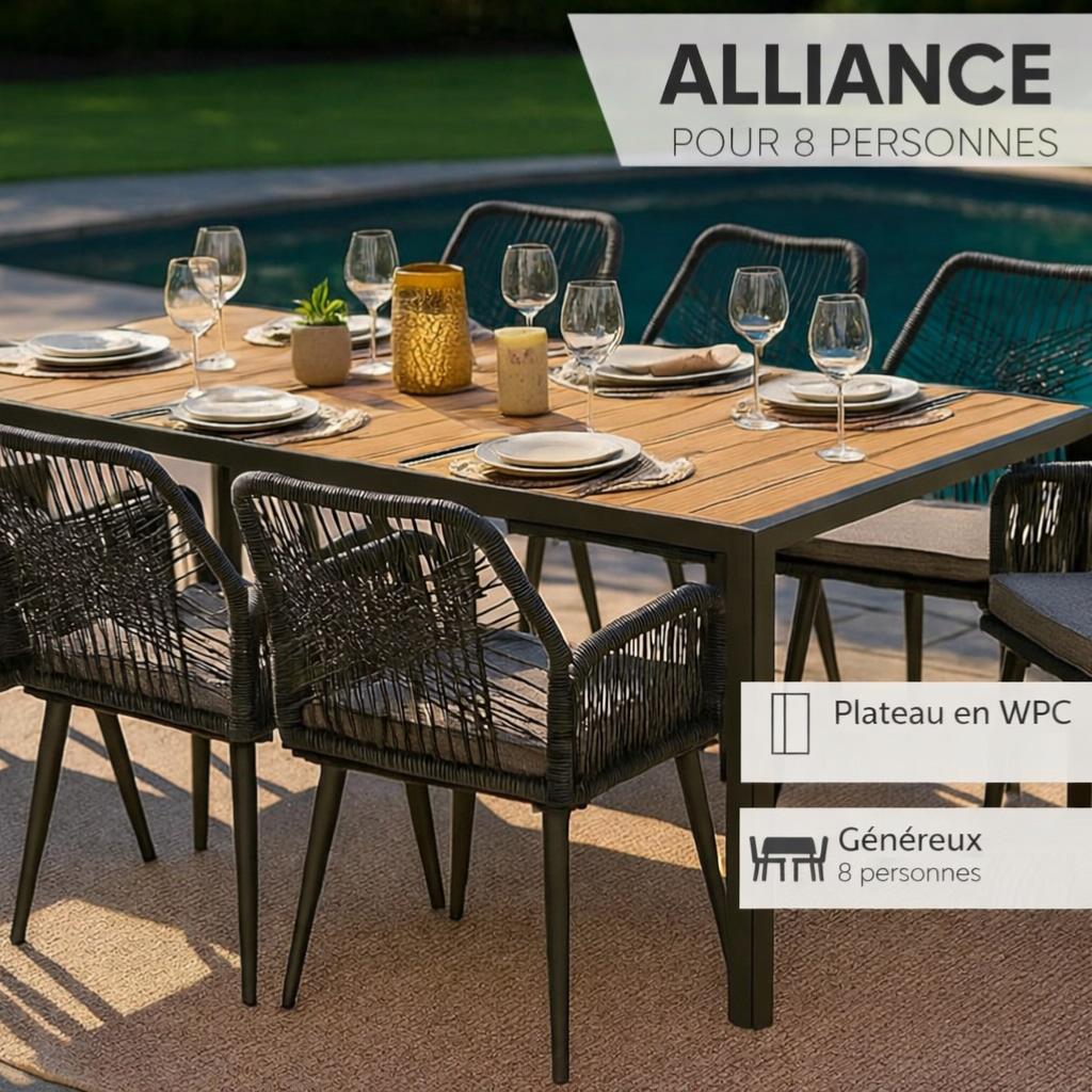 L’ensemble repas de jardin anthracite, ALLIANCE 8 personnes associe table en WPC et chaises en corde tressée pour un extérieur élégant et confortable.