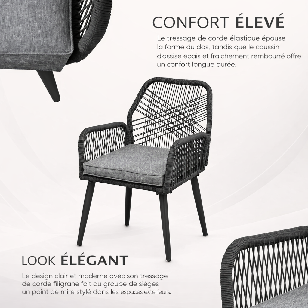 Son design GRIS ANTHRACITE contemporain repose sur une structure en acier thermolaqué, reconnue pour sa solidité, sa résistance à la corrosion et sa longévité en extérieur. Les chaises en corde tressée d’extérieur offrent un rendu visuel raffiné tout en garantissant une excellente tenue face aux UV et à l’humidité.