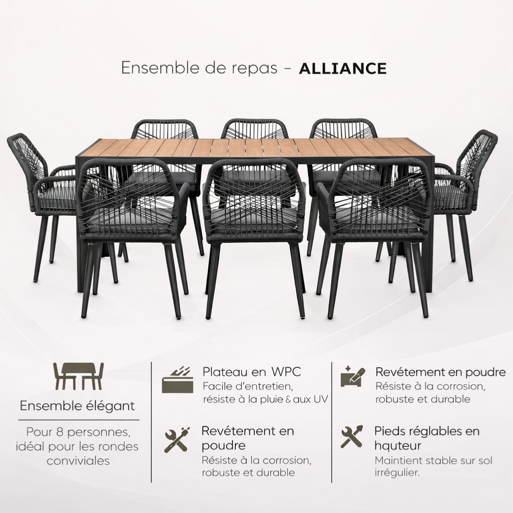 Apportez style, confort et durabilité à votre extérieur avec l’ensemble repas de jardin ALLIANCE, spécialement conçu pour accueillir jusqu’à 8 convives dans un cadre élégant et convivial. Idéal pour les repas en famille ou entre amis, il s’intègre parfaitement sur une terrasse, un balcon spacieux ou dans un jardin moderne.