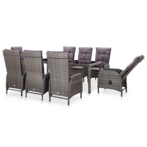 Salon de jardin confort, en résine tressée gris et noir, composé de 1 table de 190 cm avec plateau verre, 8 fauteuils inclinables, avec coussins d'assise et dossier.