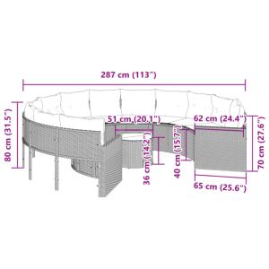 Ce salon de jardin XXL de 290 cm de diamètre grand confort avec coussins de dos de 13 cm d’épaisseur, est aussi équipé d’une table basse avec plateau en verre .