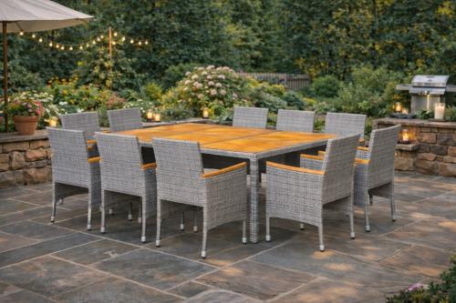 SALON de jardin acacia et résine tressée GRIS, 4 ou 8 places, modèle ANTIGUA