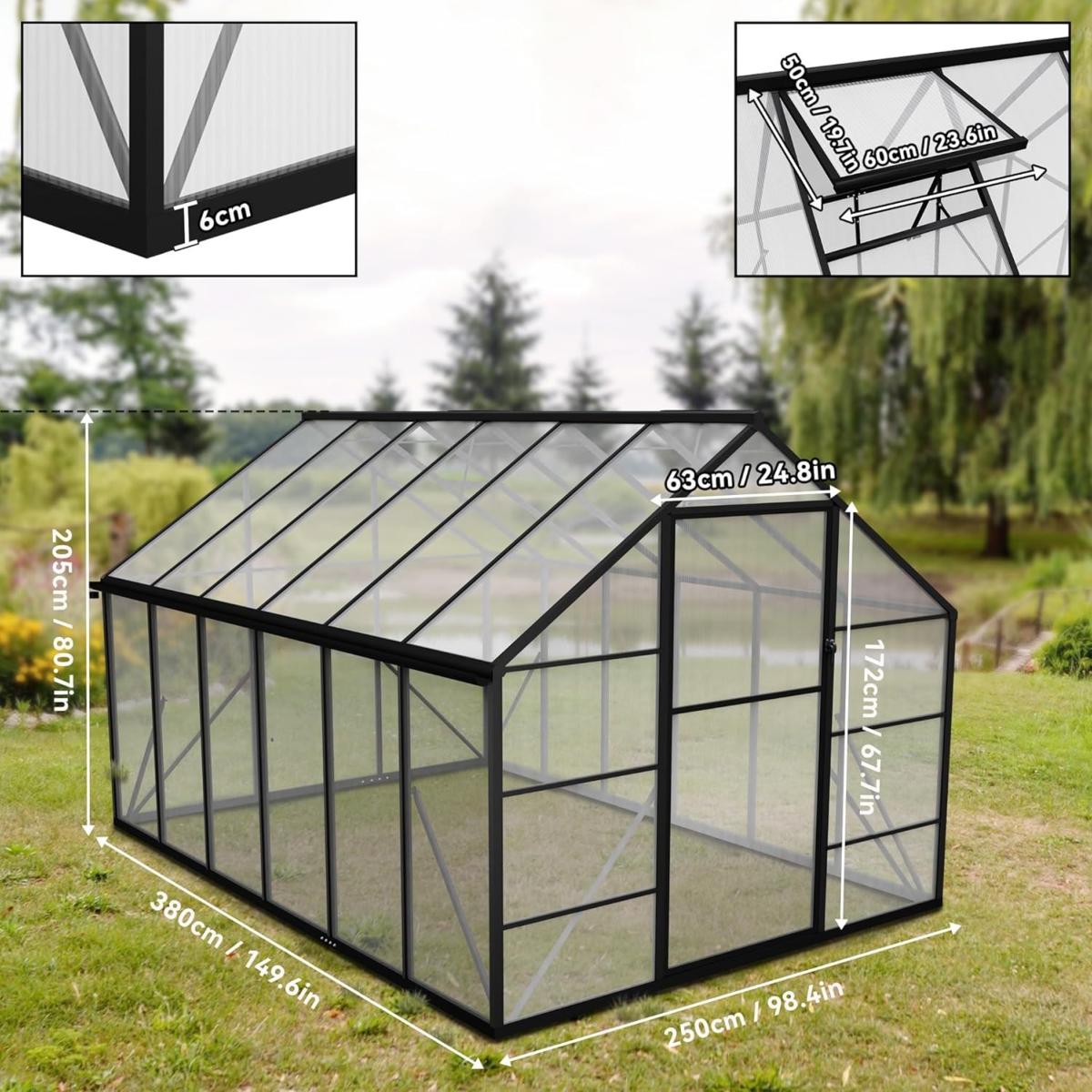 Serre de jardin en aluminium noir, largeur 250 cm, équipée de panneaux polycarbonate double paroi 4 mm. Isolation thermique renforcée, porte coulissante, fenêtres de toit, idéale pour potager et cultures toute l’année. Livraison gratuite.