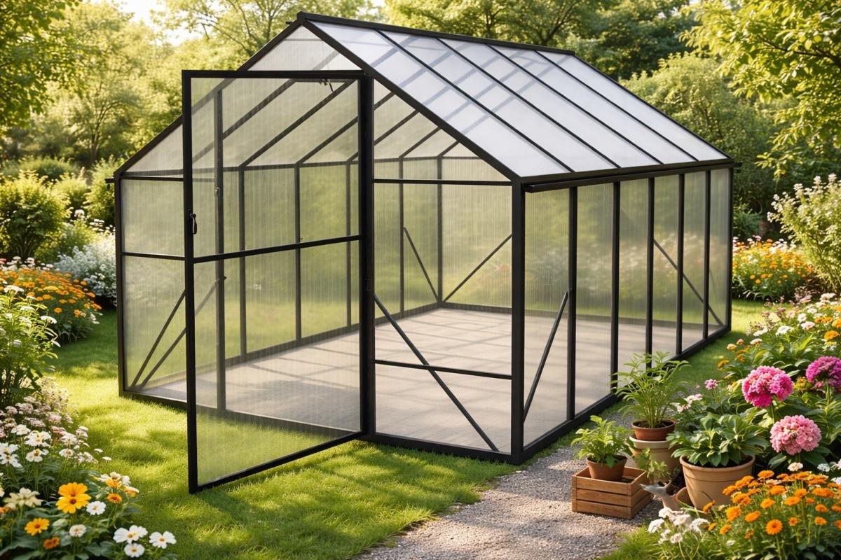 Cultivez vos plantes dans des conditions optimales toute l’année grâce à cette serre de jardin en aluminium noir de 250 cm de largeur, équipée de panneaux en polycarbonate double paroi de 4 mm, conçue pour offrir robustesse, isolation thermique et excellente luminosité.