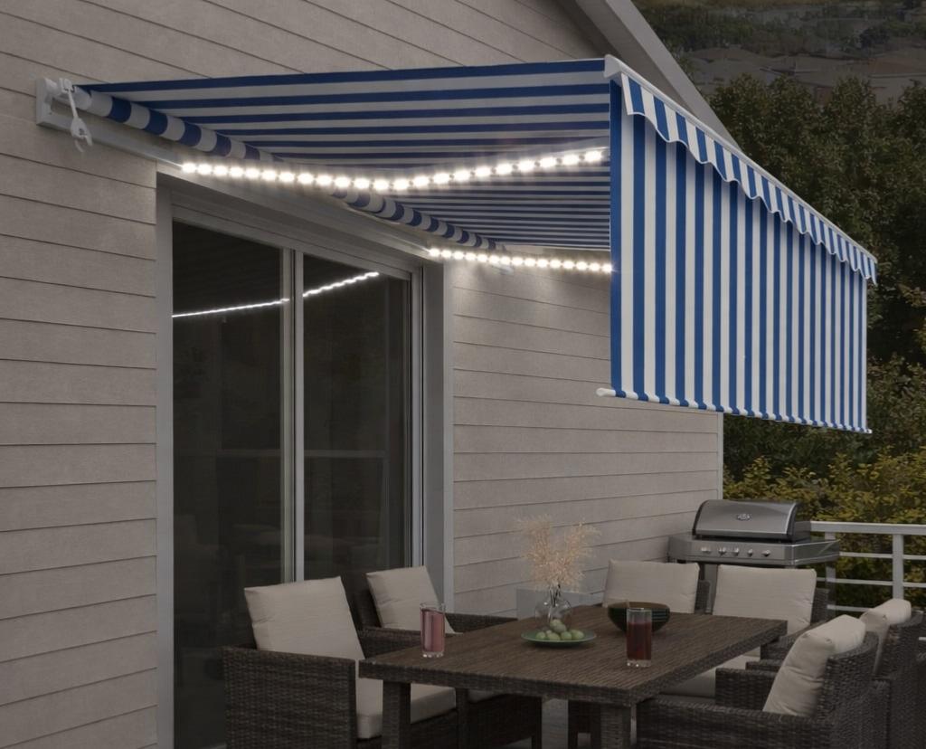 Store banne motorisé XL 5 x 3 m avec LED solaires, détecteur météo automatique et lambrequin vertical rétractable pour une protection maximale.