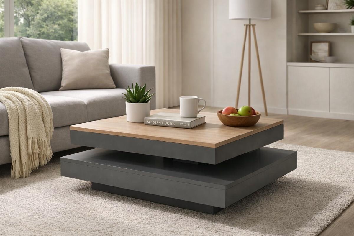 Apportez modernité et fonctionnalité à votre salon avec la table basse carrée pivotante MIRAGE, un meuble compact et intelligent conçu pour optimiser votre espace de vie.