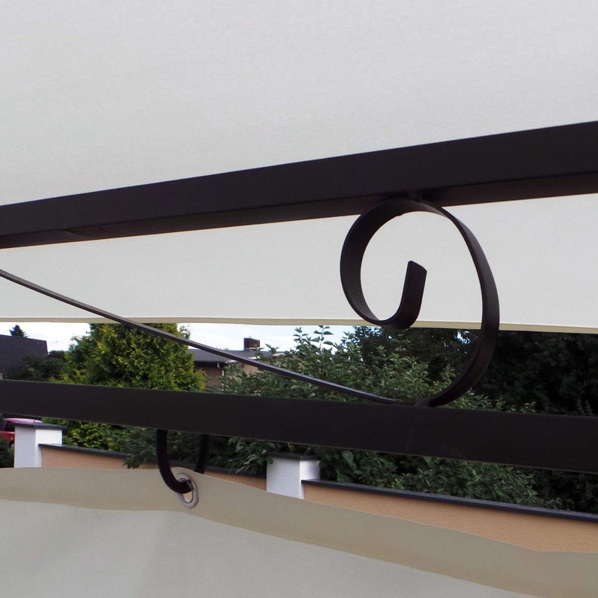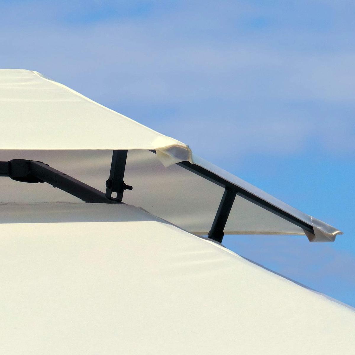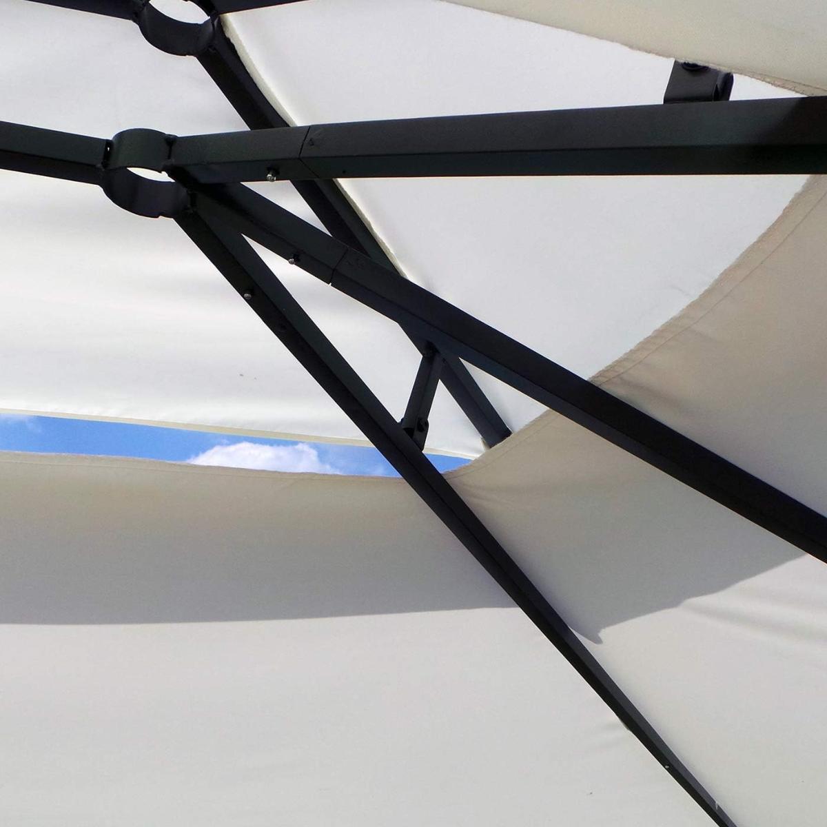 Sa structure en acier thermolaqué assure une excellente solidité et stabilité. Le toit textile en deux parties favorise la ventilation, limitant l’accumulation de chaleur sous la tonnelle.