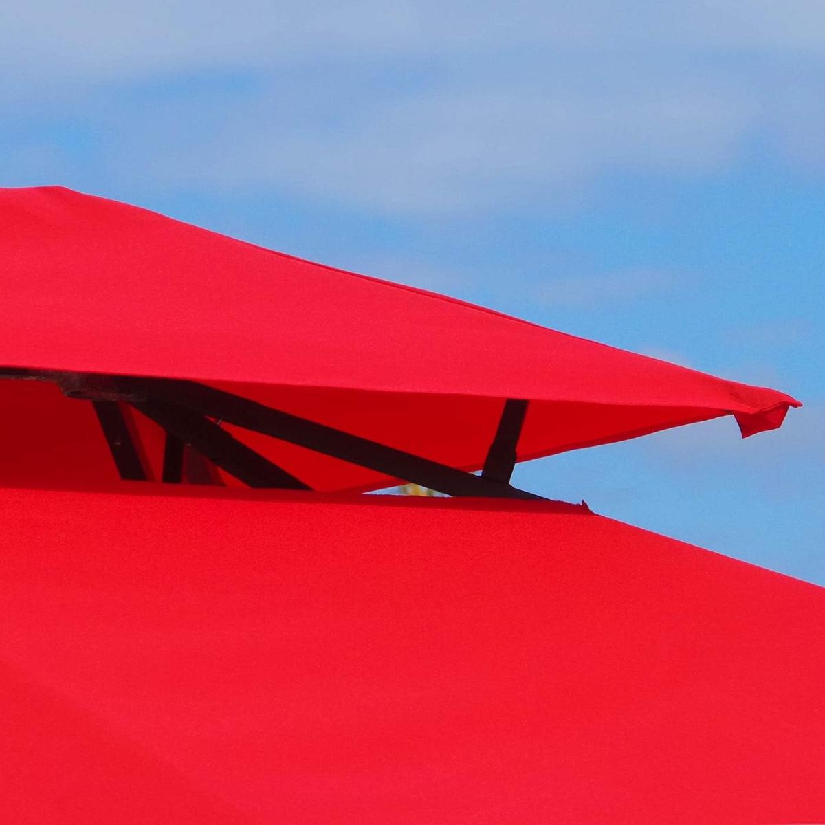 Sa structure en acier thermolaqué assure une excellente solidité et stabilité. Le toit textile en deux parties favorise la ventilation, limitant l’accumulation de chaleur sous la tonnelle.